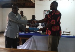 Mkurugenzi wa Halmashauri ya Mji Handeni Bw.Kenneth Haule (wa kwanza kushoto) akipokea hati ya makabidhiano ya mali na madeni kutoka kwa Bw.William Makufwe Mkurugenzi wa Halmashauri ya Wilaya Handeni....